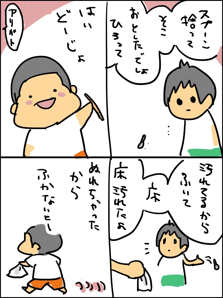 スプーンについてた調味料が床についてしまっていたので、拭いてとお願いするも返事なし。ただ床を何回か確認していたので、ここ!ここについてるよ!と指差しして拭いて欲しいところを明確にする。